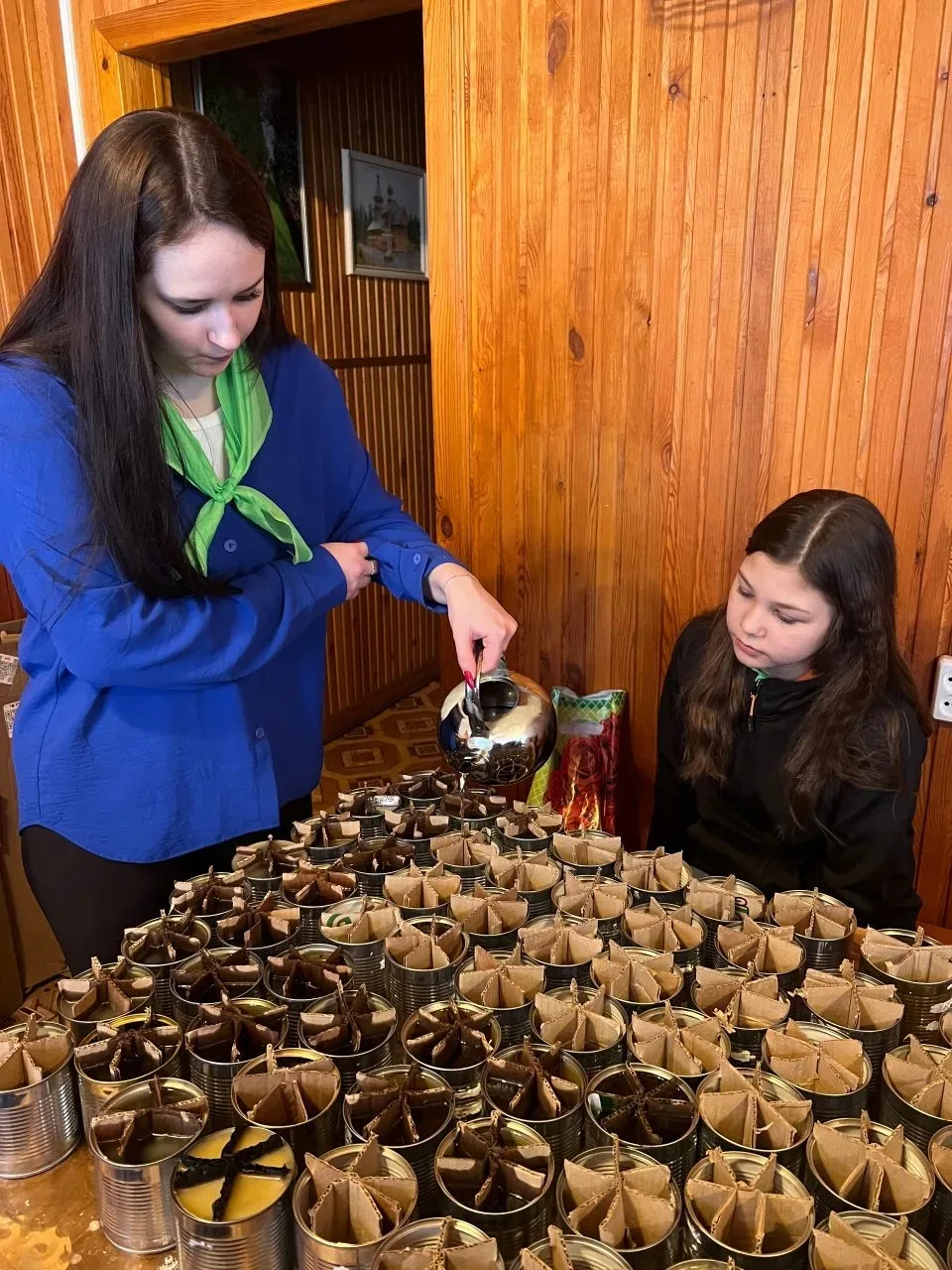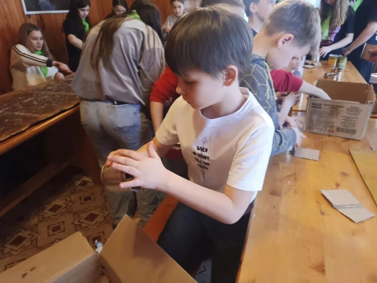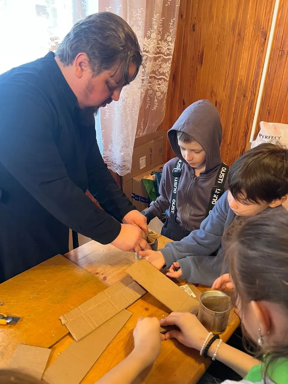 На каникулярной неделе воспитанники пришкольного лагеря приняли участие в изготовлении свечей. Перед работой иерей Даниил рассказал ребятам о необходимости и значении свечи для защитников. Затем отец Даниил показал, что и как нужно делать, и каждый взялся за работу. Кто-то подносил пустые банки, кто-то резал картон на фитильки, кто-то вставлял картон в банки виде снежинки, кто-то заливал. В итоге было сделано много окопных свечей и все от проделанной работы были рады, так как каждый смог внести свой вклад в Победу.