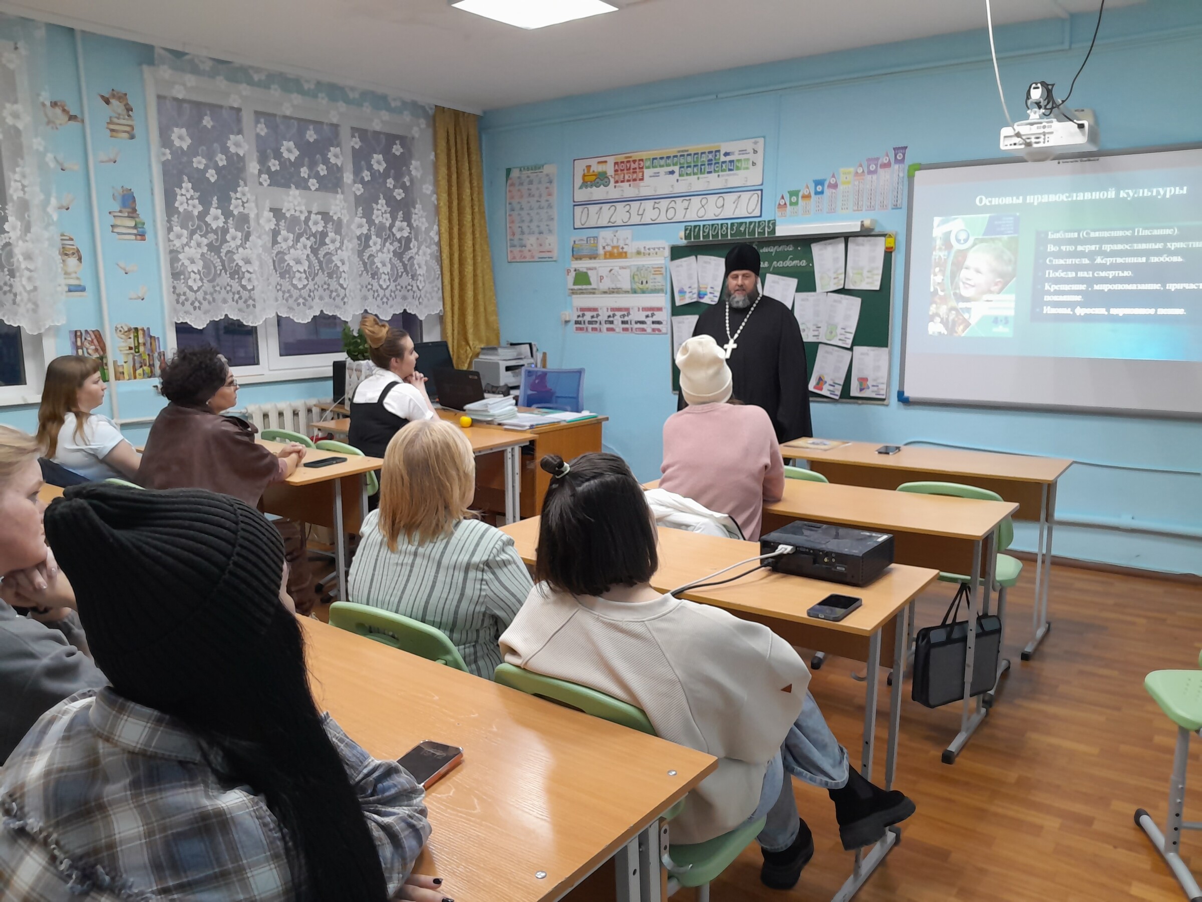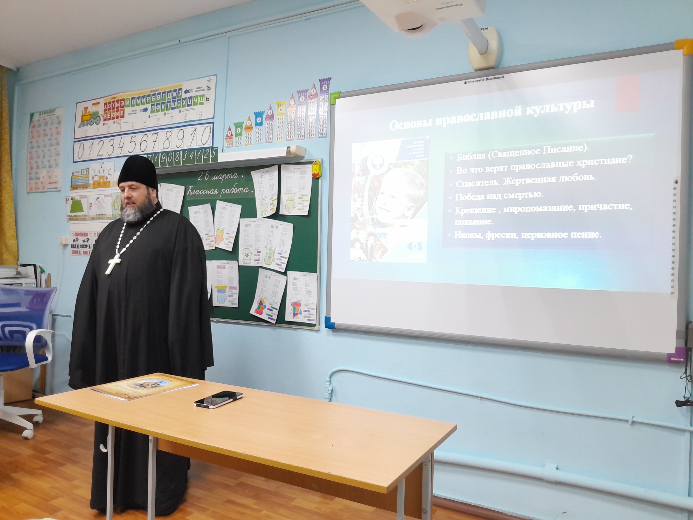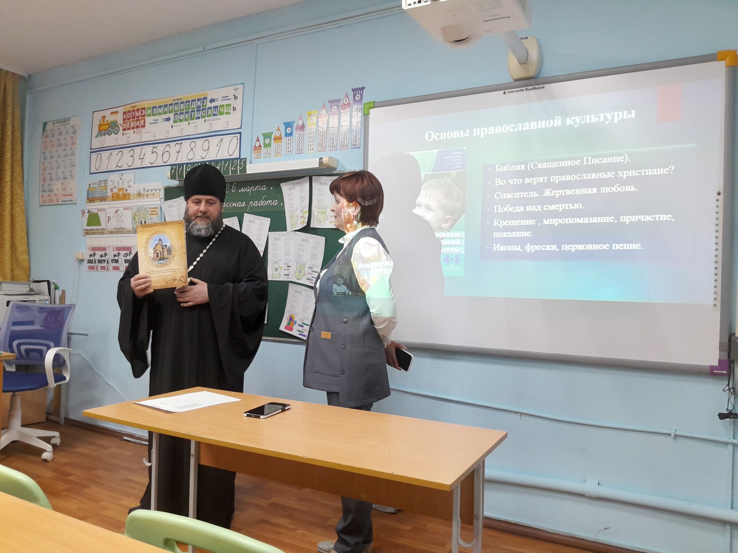В начале собрания прозвучало выступление классного руководителя 3 класса Наталья Николаевна Кляхина, которая рассказала о содержании учебного курса «Основы религиозных культур и светской этики» и его нормативно-правовой базе. Преподаватель сообщила, что по статистике прошлого года 11 из 14 учеников 4 класса выбрали в качестве основного модуля «Основы православной культуры».