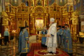 «Дорогие отцы, братья и сестры, позвольте всех вас от сердца, от души поблагодарить всех за общие молитвы! Мы собрались в этот особый для нашего края, нашего собора и в целом православной церкви день и сегодня мы чтим образ Божией Матери «Отрада и Утешение». В Ватопедском монастыре Святой Горы Афон, икона «Надвратница» обратилась к братии, которой угрожала опасность от сарацинов, дабы не открывали врат монастыря. Во время обращения младенец Спаситель начал закрывать уста Матери, утверждая, что братия грешна и получит по делам своим. Но Матерь Божия отводит руку младенца в сторону и так запечатлевается на святом образе, который именуется «Отрада и Утешение». Копия этого образа имеется в нашем мужском монастыре. Она была написана в Ватопедской обители. Мы сегодня чтим святого иконописца Максима Грека, и хотелось бы отметить, что часть святых мощей Максима Грека была растёрта и внесена в краску, которой и была написана наша икона «Отрада и Утешение». Мы сегодня чтим этот особый образ, нашу спасительницу. Множество раз она являлась по всему миру в разных образах.