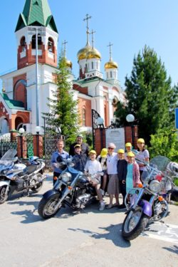 В свою очередь участники лагеря пригласили гостей посетить любимый храм. Иерей Константин познакомил байкеров с храмом, вместе помолились. Зажгли свечи и даже поднялись впервые в жизни на колокольню. После беседы о.Константин каждому подарил иконы Святой Троицы и в ответ гости лагеря пообещали, что обязательно будут посещать храм и приедут в гости к ребятам в начале учебного года воскресной школы.