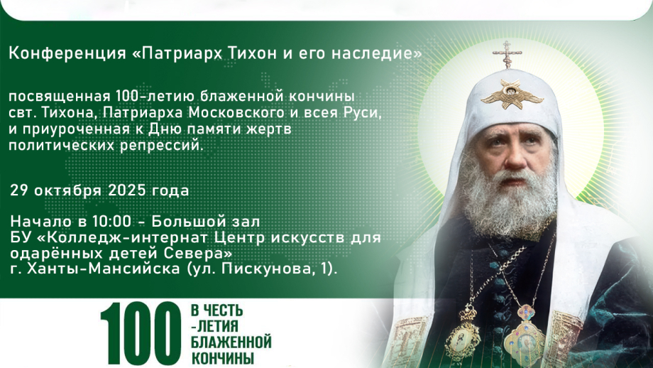 29 октября 2025 года по благословению Его Высокопреосвященства Высокопреосвященнейшего Павла, митрополита Ханты-Мансийского и Сургутского, в г. Ханты-Мансийске в рамках регионального этапа XXXIV Международных Рождественских образовательных чтений «Просвещение и нравственность: формирование личности и вызовы времени» пройдёт научно-практическая конференция «Патриарх Тихон и его наследие», посвященная 100-летию блаженной кончины свт. Тихона, Патриарха Московского и всея Руси, и приуроченная к Дню памяти жертв политических репрессий.