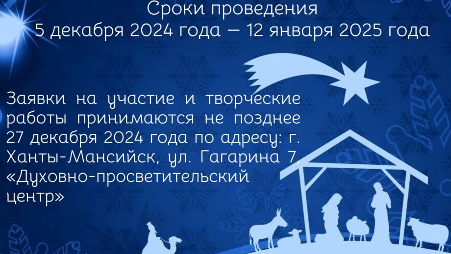 В Ханты-Мансийском благочинии по благословению Его Высокопреосвященства митрополита Ханты-Мансийского и Сургутского Павла проходит творческий конкурс «Рождественский вертеп». Организаторами конкурса являются Ханты-Мансийское благочиние Ханты-Мансийской епархии и НЧОУ ДО «Духовно-просветительский центр» г. Ханты-Мансийска при поддержке Департамента образования Администрации города Ханты-Мансийска и Комитета по образованию Администрации Ханты-Мансийского района.