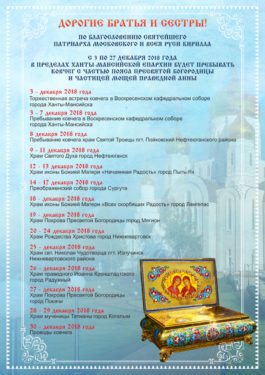 3 — декабря 2018 года в 17.00– торжественная встреча ковчега в Воскресенском кафедральном соборе города Ханты-Мансийска.