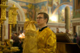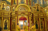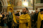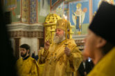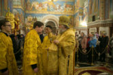 Его Высокопреосвященству сослужили: заведующий епархиальной канцелярией, иерей Сергий Нагорный; секретарь управляющего епархией иеромонах Антоний Кирпичев; духовенство собора.