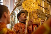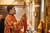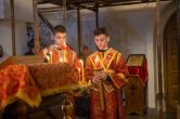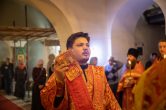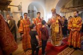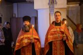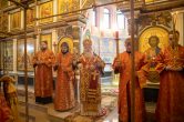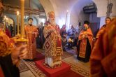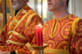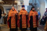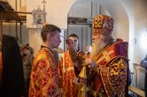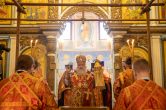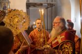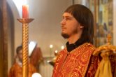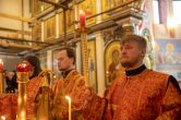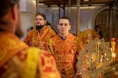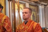 Его Высокопреосвященству сослужили: секретарь Ханты-Мансийской епархии игумен Антоний (Кирпичев), секретарь Югорской епархии иерей Николай Щерба, духовенство собора. Диаконский чин возглавил Александр Дидковский.