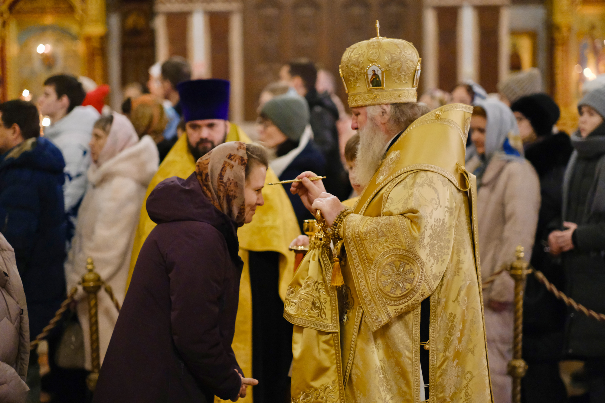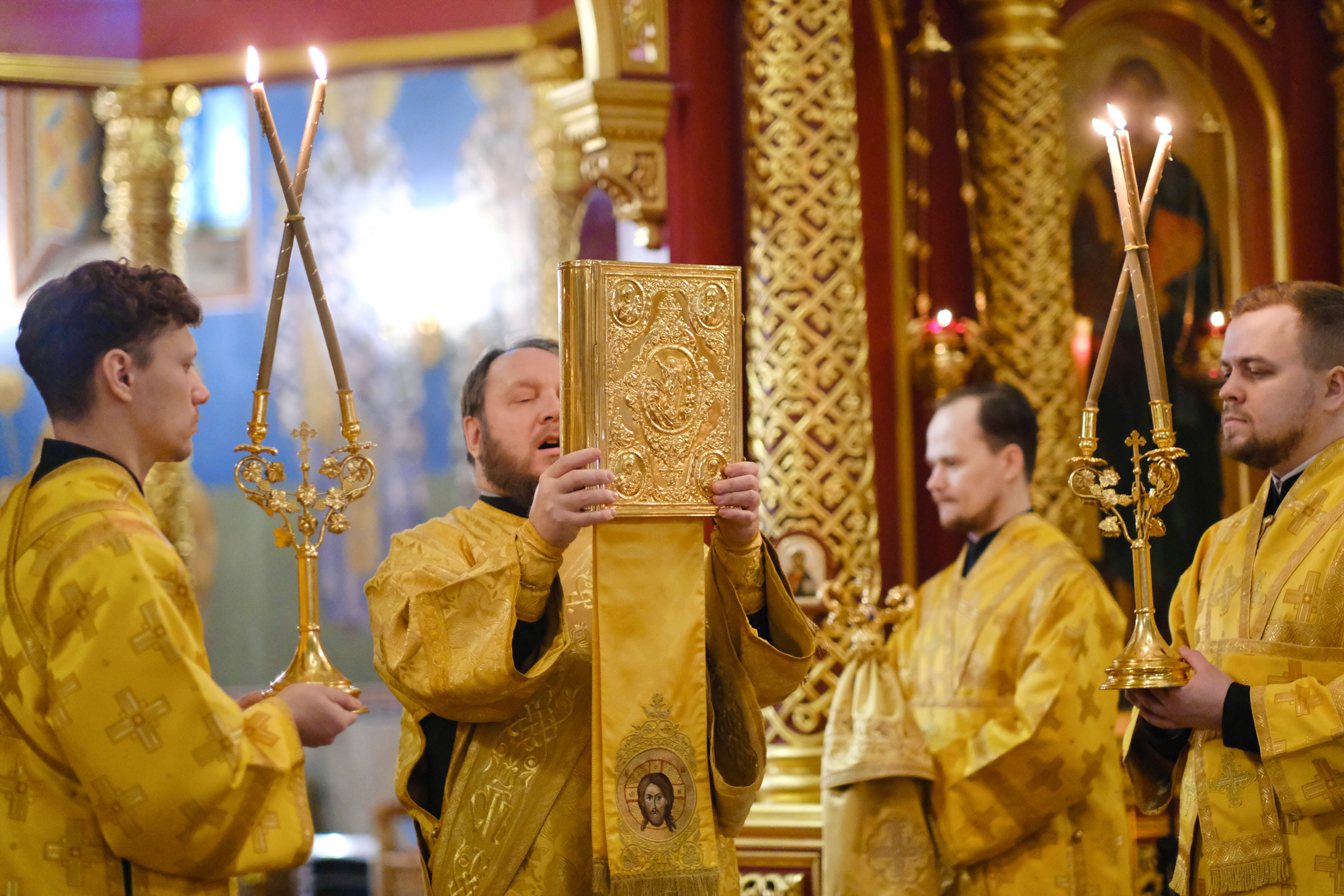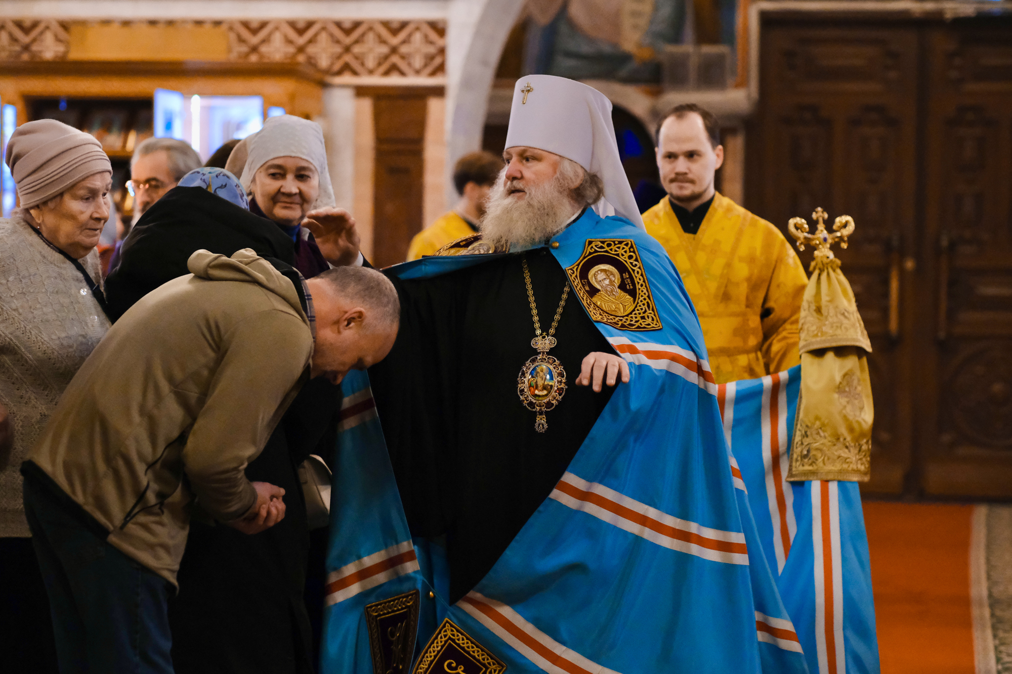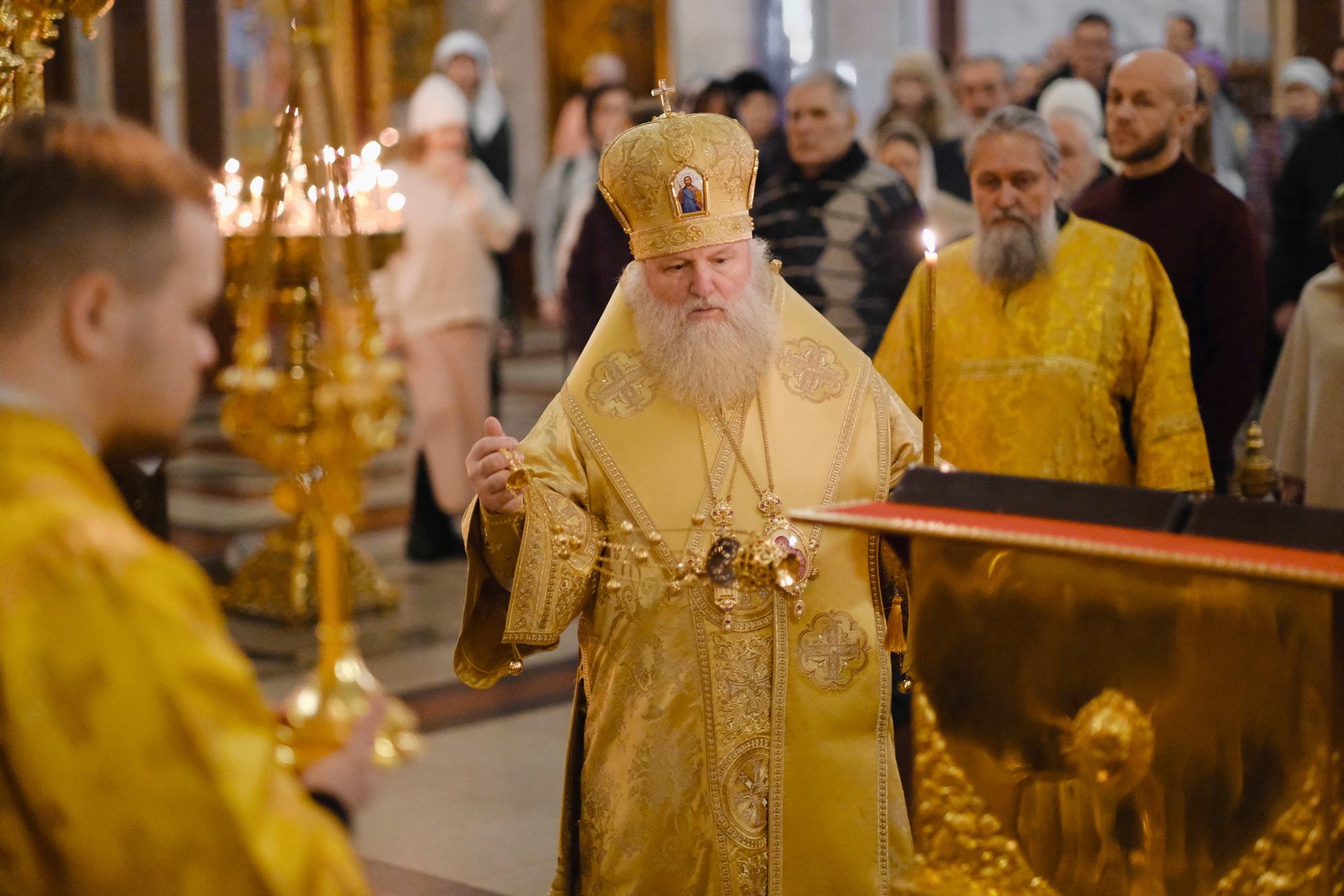 21 февраля 2026 года, в канун Недели сыропустной, воспоминания Адамова изгнания, прощеное воскресенье, обретения мощей свт. Тихона, патриарха Московского и всея Руси, митрополит Ханты-Мансийский и Сургутский Павел совершил всенощное бдение в Воскресенском кафедральном соборе г. Ханты-Мансийска.
