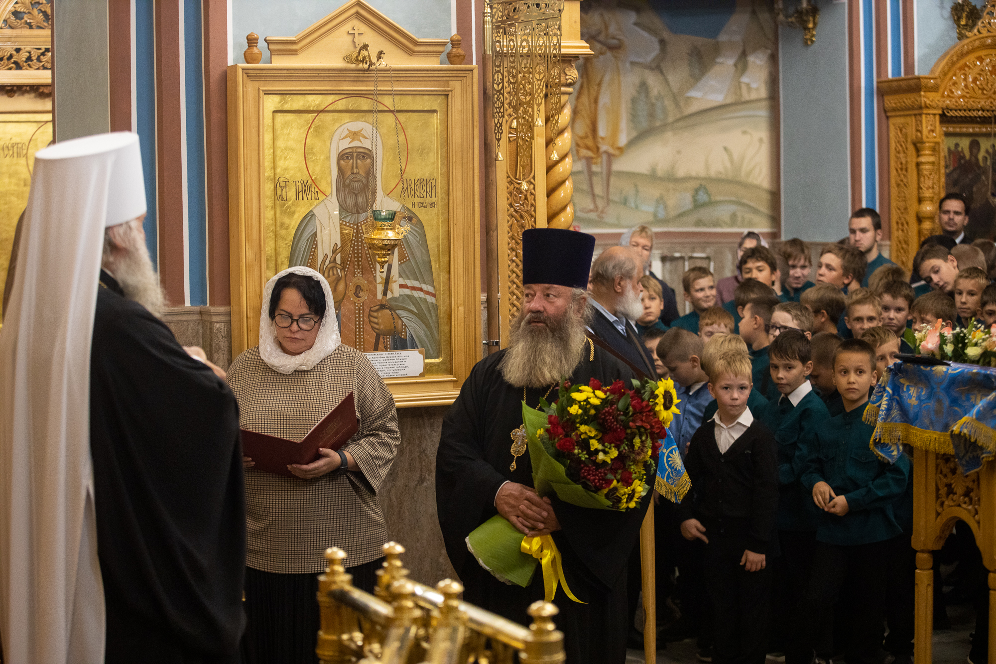 «Дорогие братья и сестры, учащие и учащиеся, всех вас от сердца, от души поздравляю с праздником Рождества Пресвятой Владычицы нашей Богородицы. Сегодня мы прославляем Её Рождество, чтим Её святых родителей, ибо они удостоились родить и вырастить достойную Царицу Неба и Земли. И мы молим и просим ту, что удостоилась во чреве от Духа Свята носить самого Господа, Нашего Спасителя, который дал все спасительные средства для того, чтобы ни едина душа не погибла. И здесь сегодня- начало нашего спасения, родилась та, которая вместит невместимого, как говорят многие святые отцы.Мы знаем из жития Её, что Она была кроткой и смиренной, и услышав благую весть прорекла: «Се раба Господня, да будет по глаголу Твоему». И это пример для нас — стараться быть кроткими и смиренными в своей жизни. Недаром святые говорят, что смирение есть спасение, что оно выше поста и молитвы.