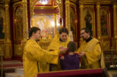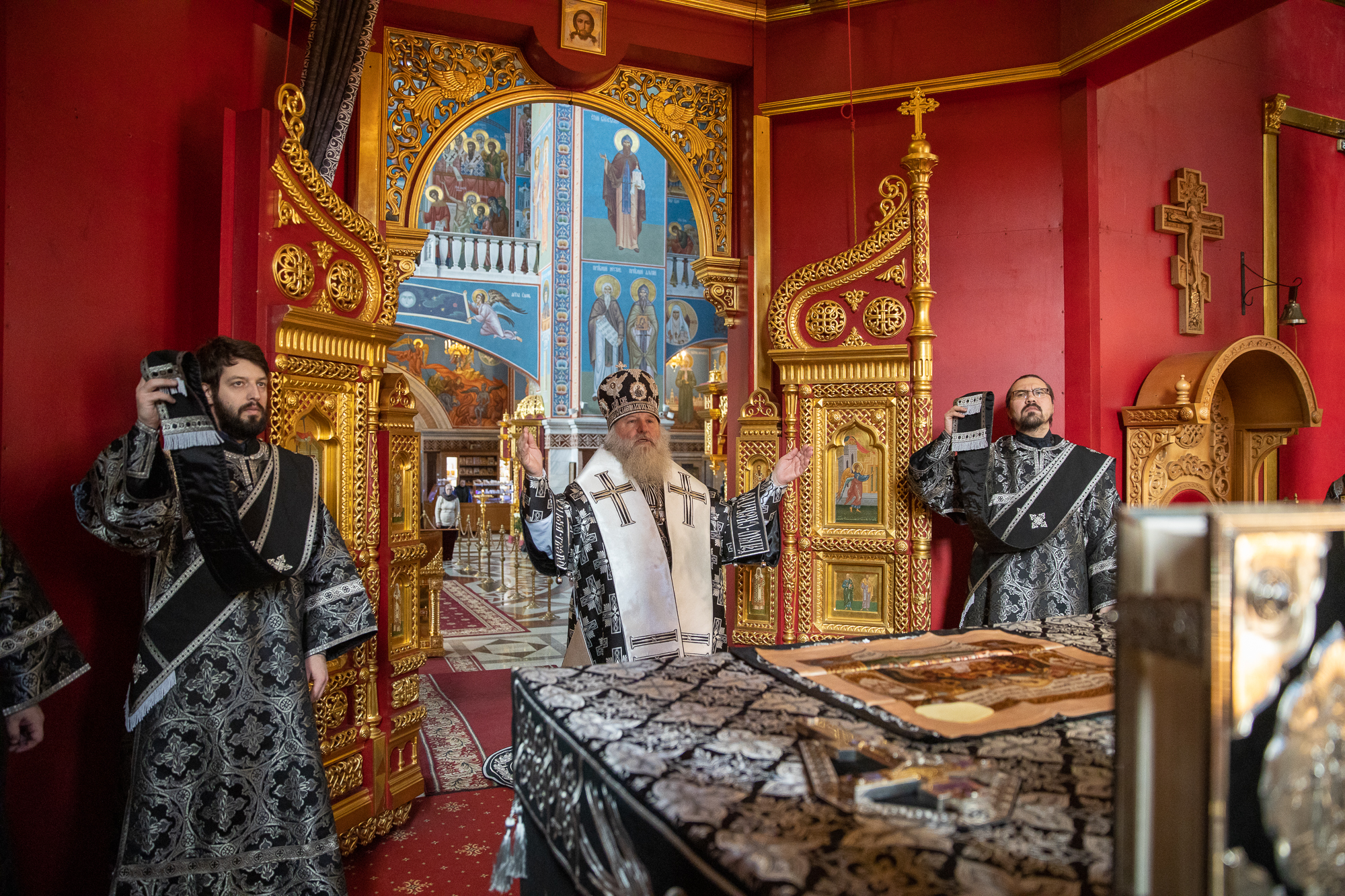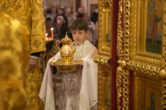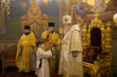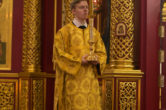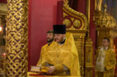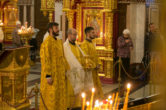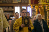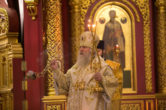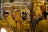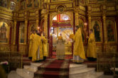 На сугубой ектении были вознесены особые прошения, ключарь Воскресенского кафедрального собора иерей Александр Петюр прочитал молитву о Святой Руси.