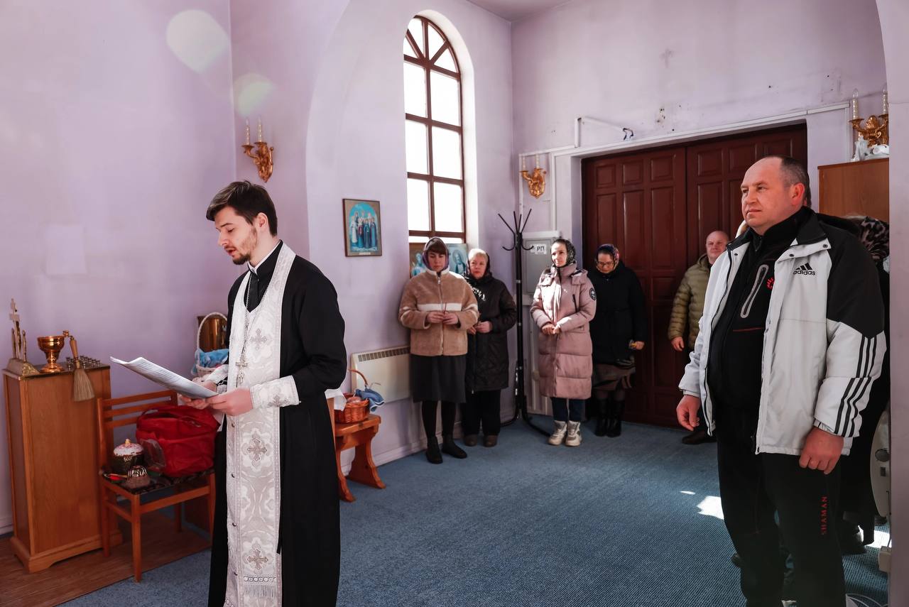 Освящение совершил иерей Тихон Морозан клирик храма святой мученицы Татианы г. Когалым . Он прочел молитвы, окропил святой водой снедь и поздравил всех прихожан с наступающим Великим праздником — Воскресением Христовым.