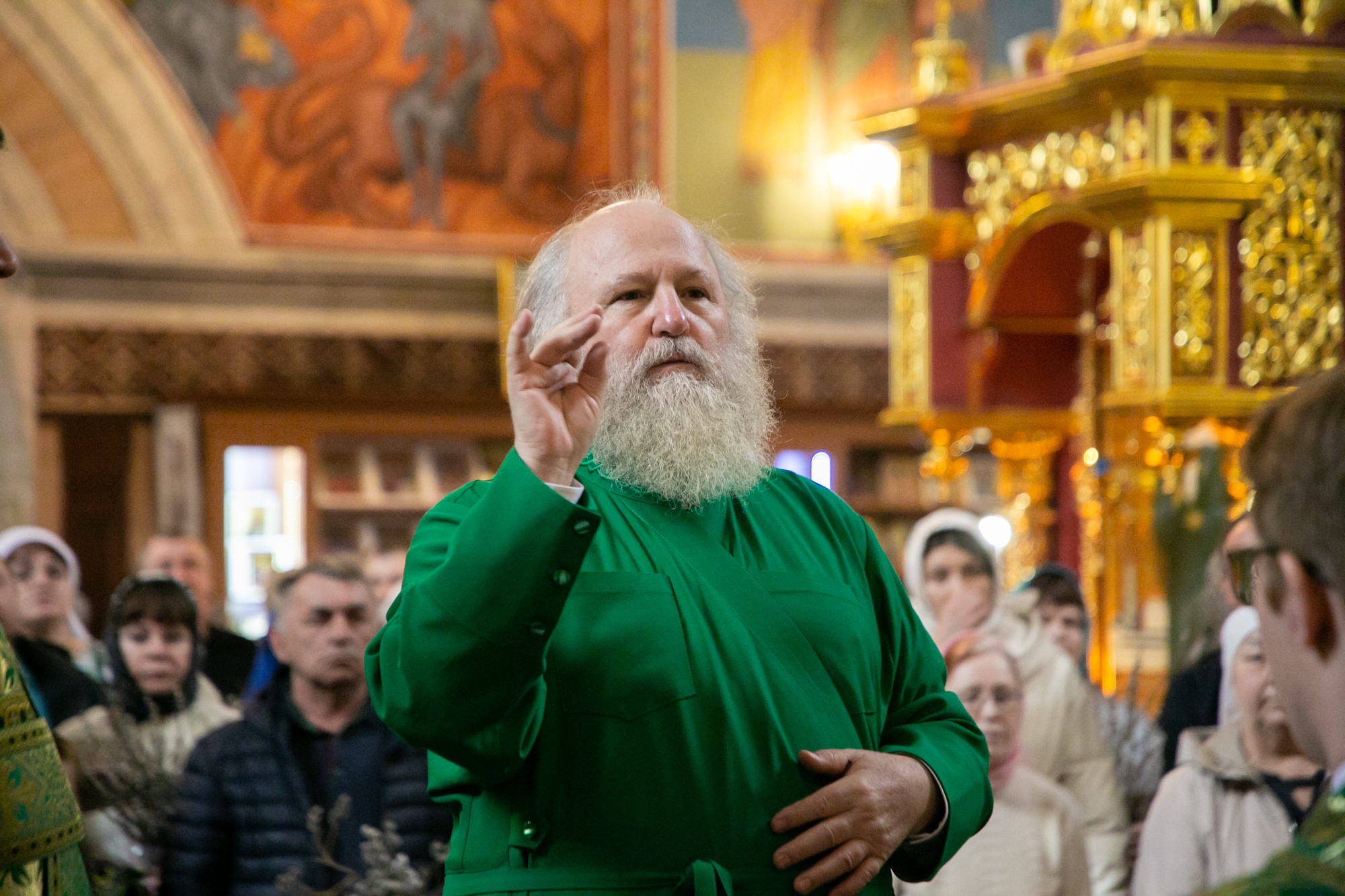 «Дорогие братья и сёстры, позвольте от сердца, от души всех поблагодарить за общие молитвы и поздравить с праздником Входа Господня в Святой град Иерусалим! Это великое событие, когда Господь наш Иисус Христос въезжает на осляти в град на вольную страсть, зная, зачем Он входит в этот город. И как говорит история: на лошадях въезжают воины, и это — знак войны. А Спаситель въезжает на осляти, что обозначает мир, мирное шествие.