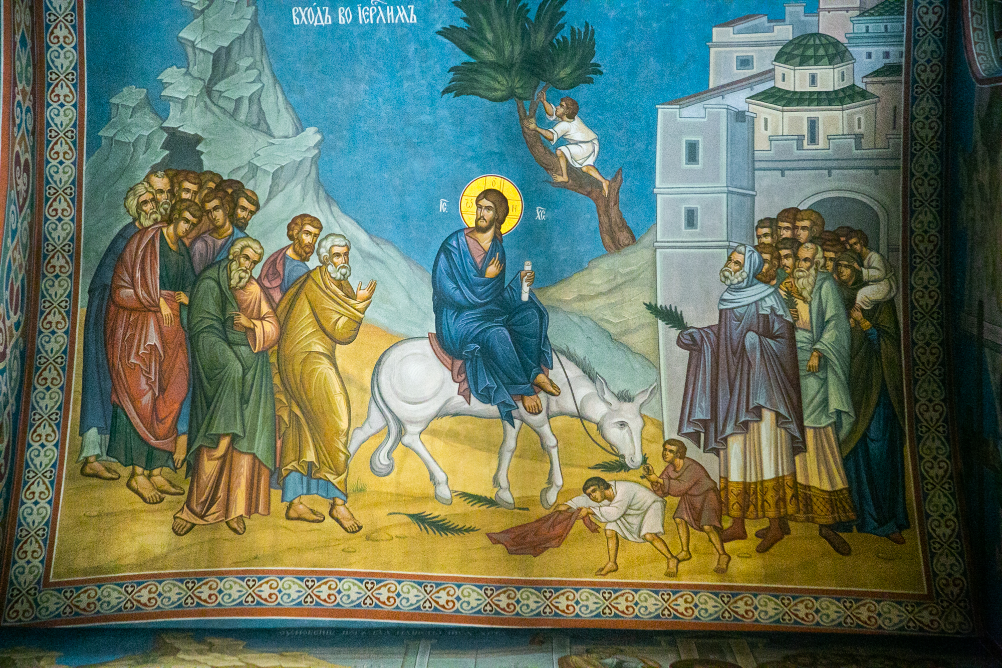 И в этот мир Господь привносит Свой период Нового Завета. А мы знаем, что там, где мир, там любовь. И вот Господь, въезжая на осляти, подчёркивает, что Он с миром, с любовью идёт на страдания ради спасения всех.