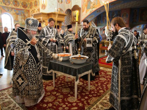 По заамвонной молитве митрополит Павел совершил молебный канон великомученику Феодору Тирону и благословение колива.