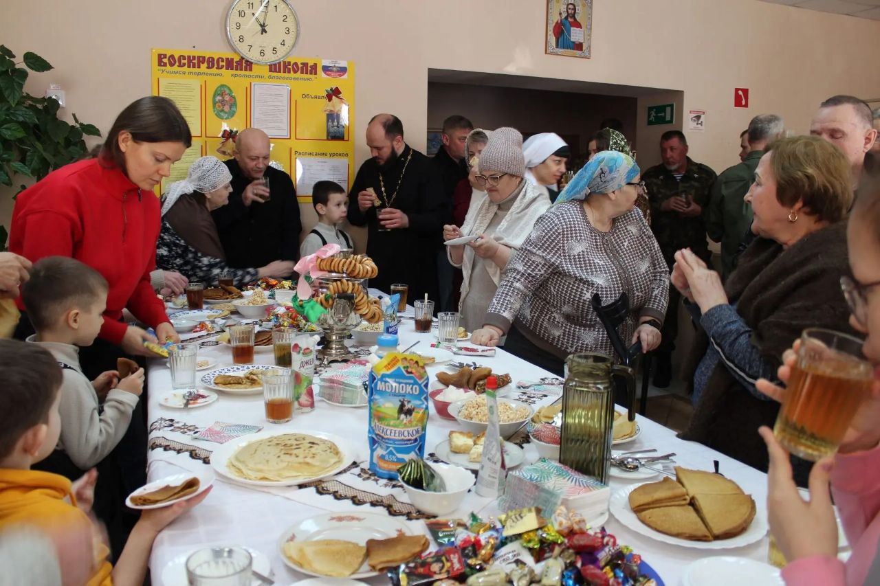 И традиционно, после совершения богослужения в храме, состоялось праздничное чаепитие с блинами и угощениями в здании воскресной школы при храме.