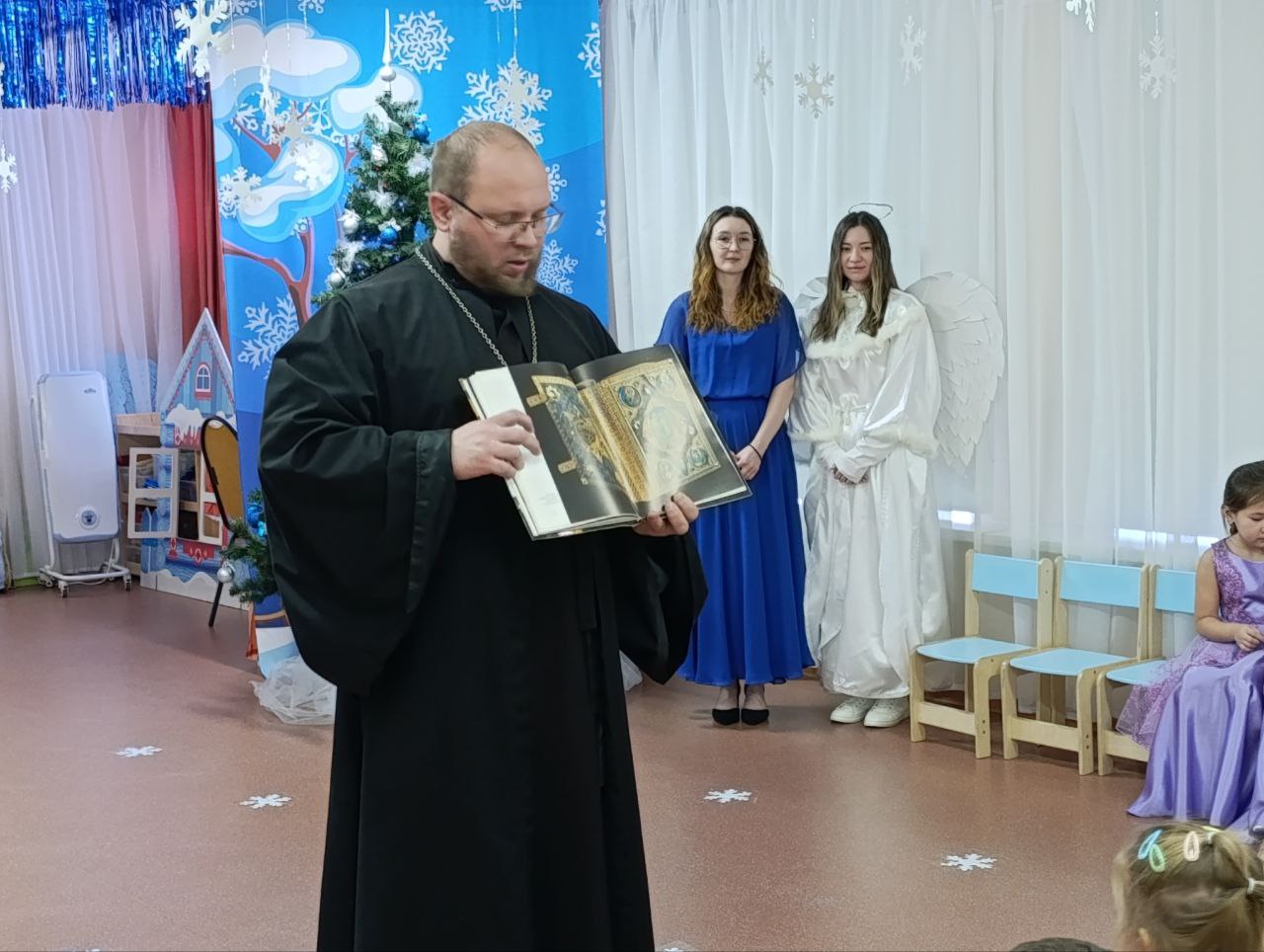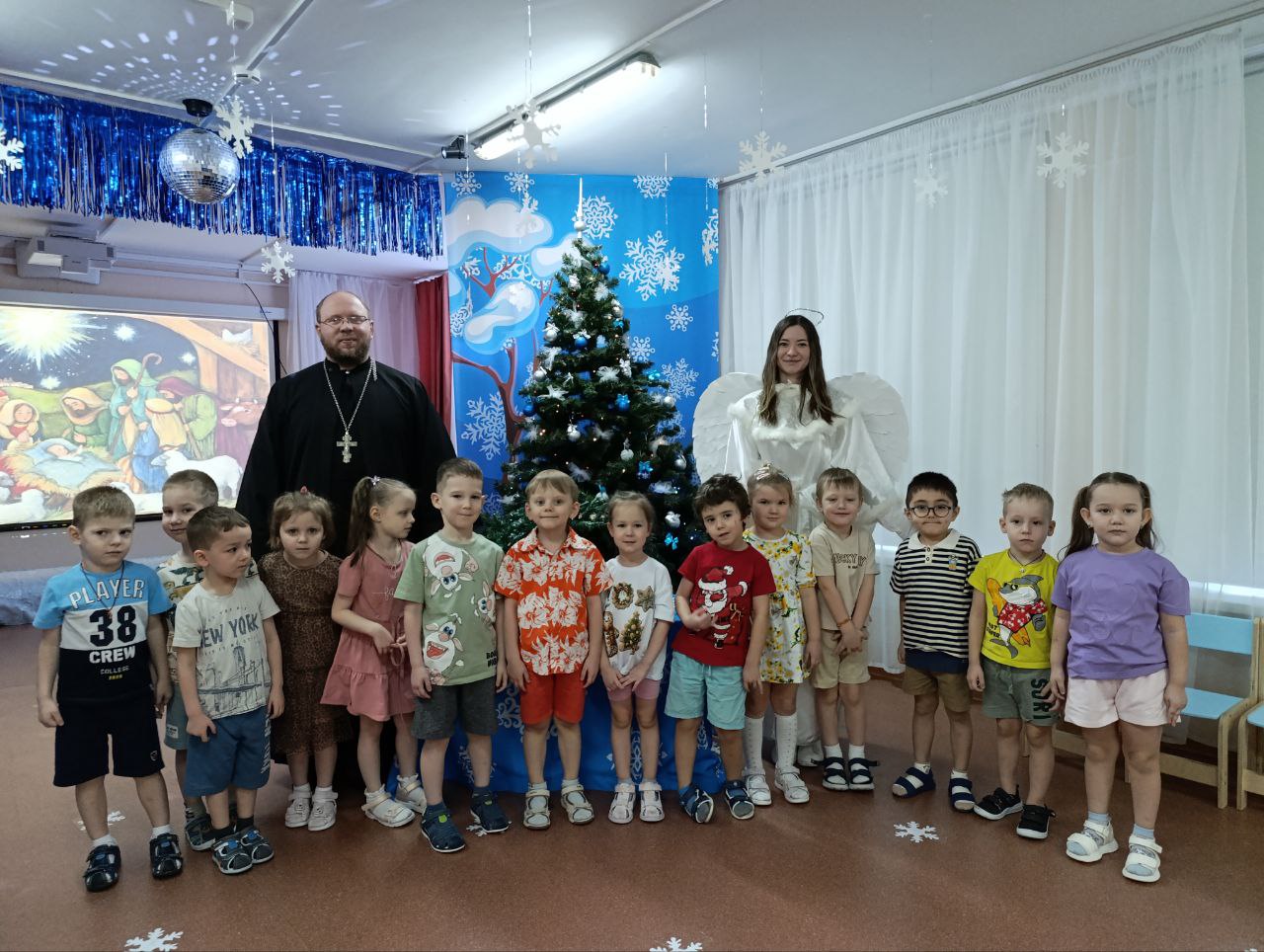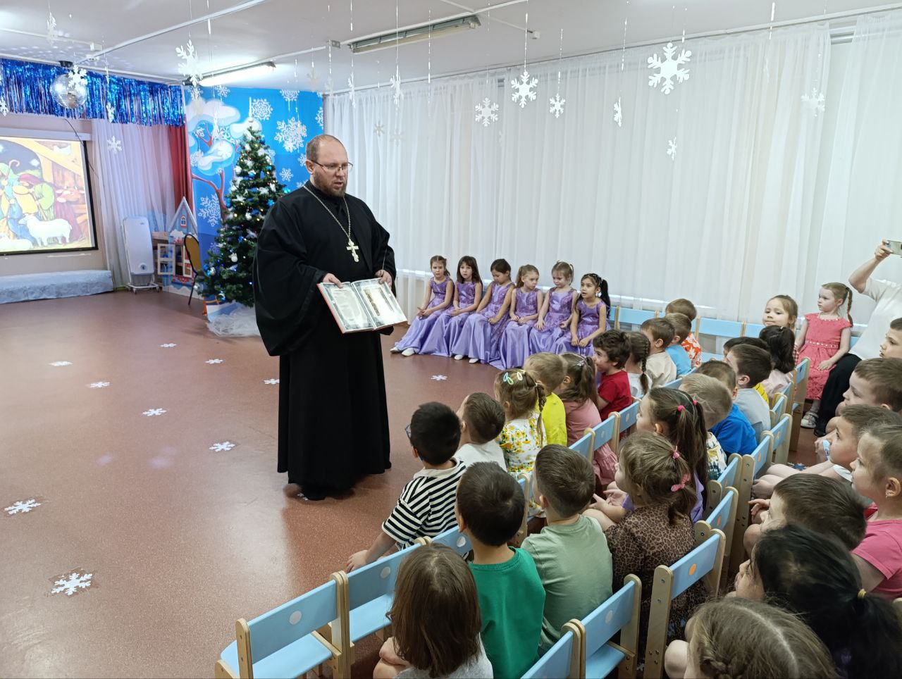 19 января 2026 года в МБДОУ 78 » Ивушки ‘ города Сургута иерей Мартынюк Сергий провел беседу с 4 — мя возрастными группами на тему : «О Рождестве Христовом и Крещении Господнем».