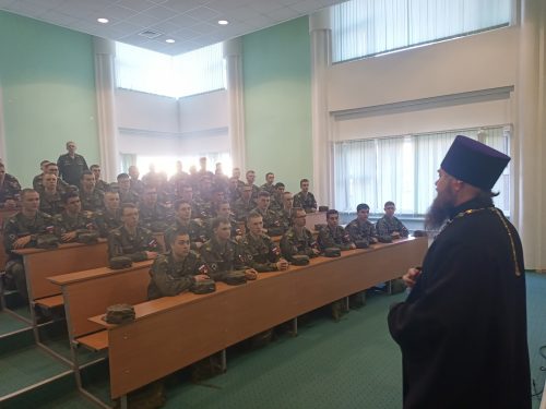 14 сентября 2023г. для студентов первого курса Югорского государственного университета, являющихся курсантами Военного учебного центра, помощник председателя отдела религиозного образования и катехизации, директор НЧОУ ДО «Духовно-просветительский центр» иерей Вячеслав Фомин провёл занятие на тему: «Духовные основы патриотизма».