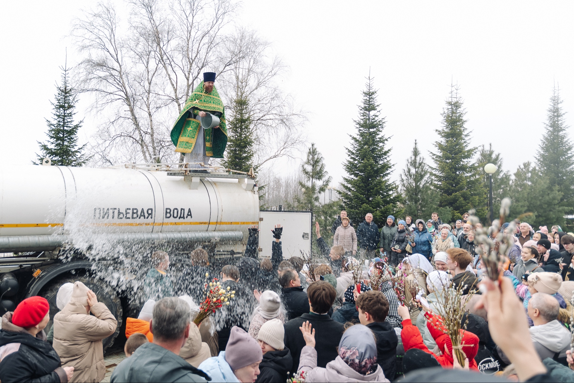 По окончании Литургии состоялось освящение воды и принесенных верующими верб.