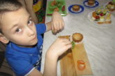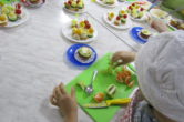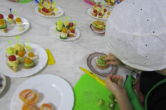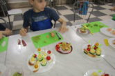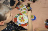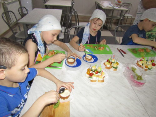 Волонтеры предложили воспитанникам приготовить канапе, маленькие бутерброды на шпажках с перепелиными яйцами, сыром и помидорами, а на десерт пирожные «Корзиночки» из песочного теста с заварным кремом с фруктами.