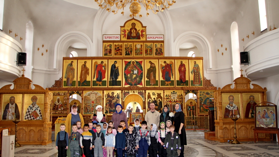 Наталья Юрьевна рассказала детям о том, как нужно вести себя в храме, громко не разговаривать, не смеяться, не бегать и не играть. В храме говорят тихо, ведут себя скромно и вежливо. Все, кто входит в православный храм, соблюдают правило: мужчины и мальчики снимают головной убор, женщины и девочки покрывают голову платком. Эта традиция означает выражение смирения, преклонения перед Богом и Его святынями. В храм приходят люди, чтобы вместе помолиться и поблагодарить Господа за милость Его, попросить у Бога здоровья, любви друг к другу, мира на планете. На стенах висят иконы, перед ними горят лампадки и свечи. Христиане молятся тому святому, кого они видят на иконе. Иконостас – одна из важнейших принадлежностей православного храма, в середине Царские врата и две других двери — северная и южная. Справа от Царских врат расположена икона Спасителя, слева – икона Богоматери. Алтарь означает небо, где обитает Бог, а храм – землю, поэтому алтарь находится на некотором возвышении.