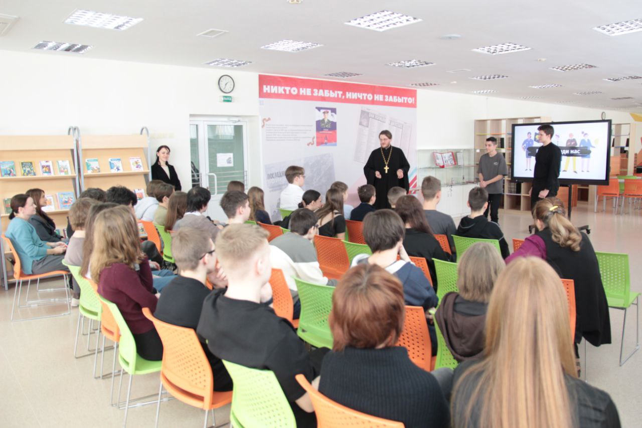 12 февраля ключарь Кафедрального Собора Воскресения Христова г. Ханты-Мансийска, иерей Александр Петюр, провел встречу с со старшеклассниками школы №4 г. Ханты-Мансийска на тему геройства и совершения добрых поступков. Ребята на примерах из жизни поразмыслили на тему совершения добра в повседневной жизни.