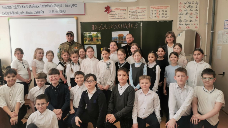 25 февраля 2025 штатный клирик храма бл. Матроны Московской г. Нижневартовска иерей Дмимитрий Плотный провёл встречу с учениками третьего класса в СОШ-№3 г.Нижневартовска. Встреча была посвящена на тему: «Что такое Родина». В ходе беседы гости урока отец Димитрий и участник СВО, Ветеран боевых действий Наиль Шарипович Хамитов рассказали детям о важности любви к родине.