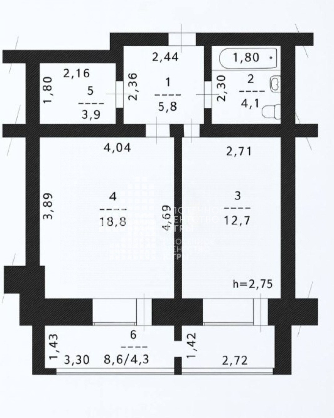 однокомнатная квартира в кирпичном доме площадью 45,3 м.кв.