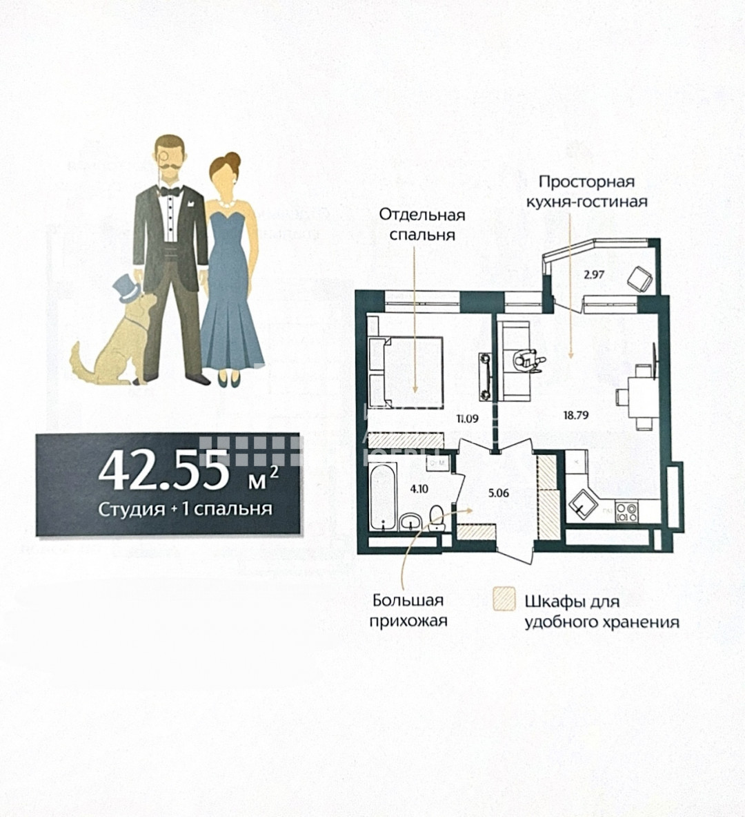 Продуманная и комфортная планировка формата - Студия +1. Просторная кухня-гостиная - 19 кв.м. создает комфортную атмосферу для совместного времяпрепровождения, праздников и уютных вечеров. Объединяет в себе зону обеденную и гостиной. Изолированная спальня с большой ванной комнатой. В квартире выполнен евроремонт. Новому хозяину останется встроенная мебель